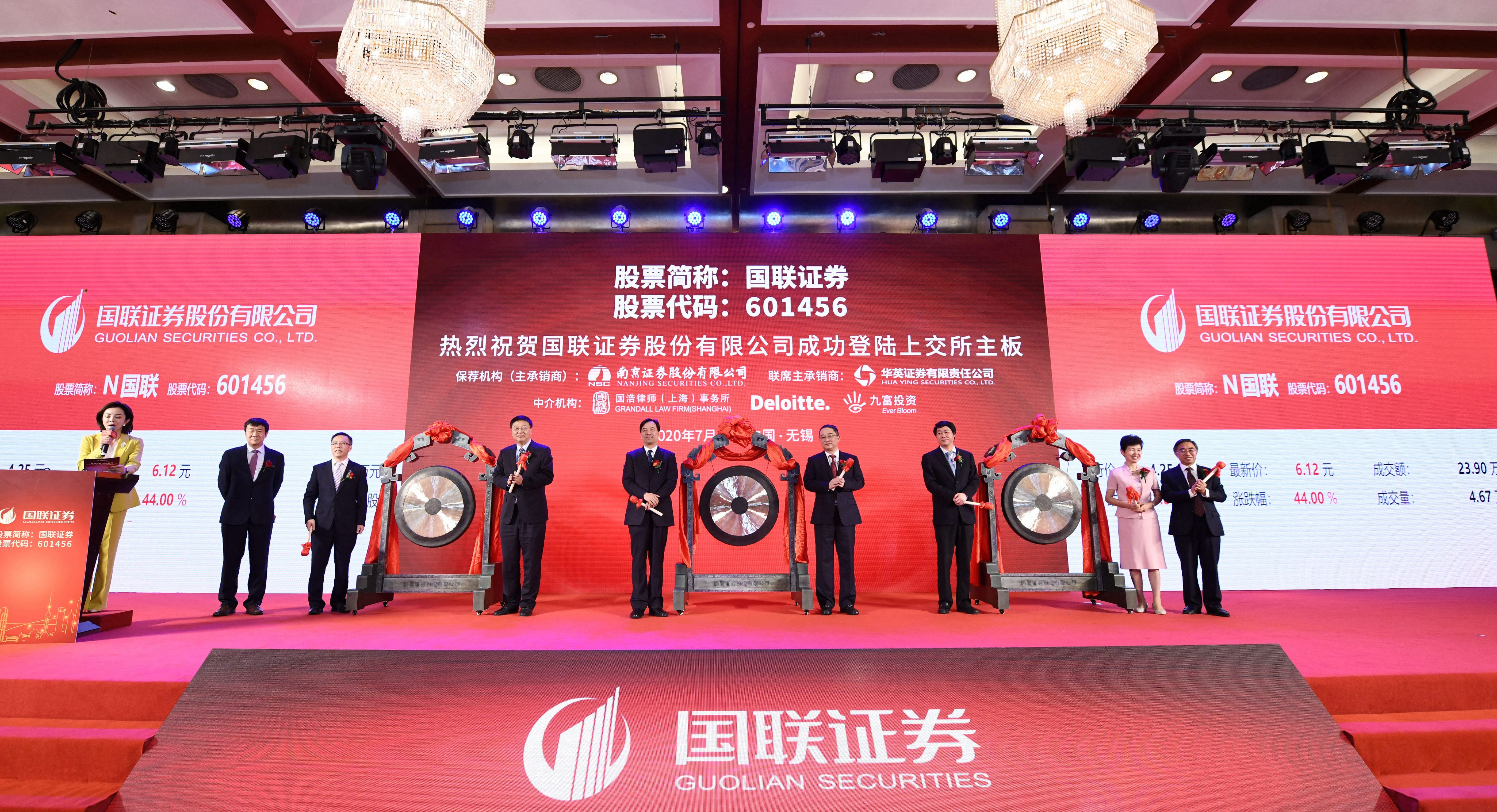 7月31日,国联证券股份有限公司(股票代码601456)成功在上交所主板挂牌上市,成为我市首家A+H上市国企、国内第13家A+H上市券商。市委常委、常务副市长朱爱勋,上海证券交易所党委委员、副总经理阙波,江苏证监局党委委员、副局长涂储斌,市政府副秘书长周子川等领导出席上市仪式,集团党委书记、董事局主席许可等集团领导班子成员和市有关部门、国联证券合作伙伴等参加仪式。