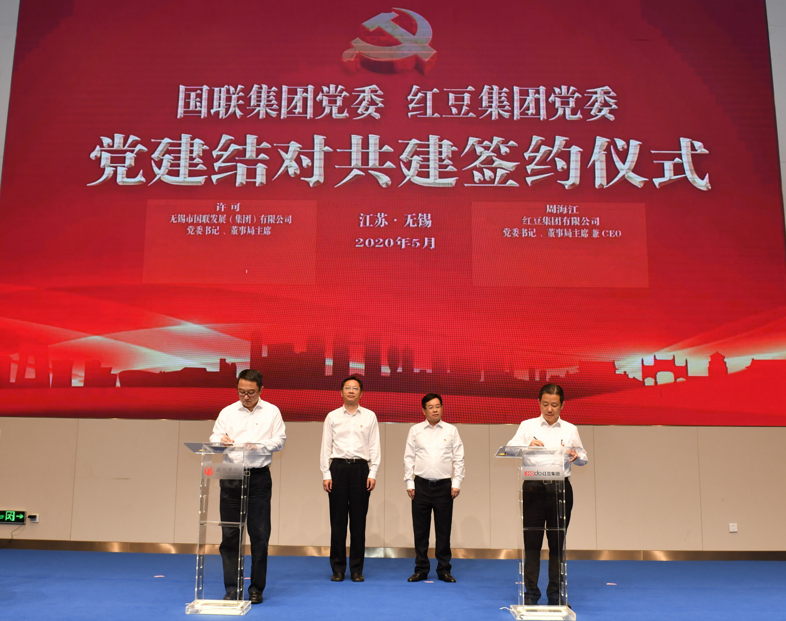 5月29日,国联集团和红豆集团举行党建结对共建暨战略合作签约仪式,无锡市委常委、组织部部长冯军,锡山区委书记顾中明等领导出席签约仪式并讲话,国联集团党委书记、董事局主席许可与红豆集团党委书记、董事局主席兼CEO周海江代表双方签订党建结对共建协议,集团党委副书记、总裁华伟荣与红豆集团董事局副主席龚新度代表双方签订战略合作协议。市委组织部副部长林茂松和双方有关领导、子企业、部门负责人参加签约仪式。