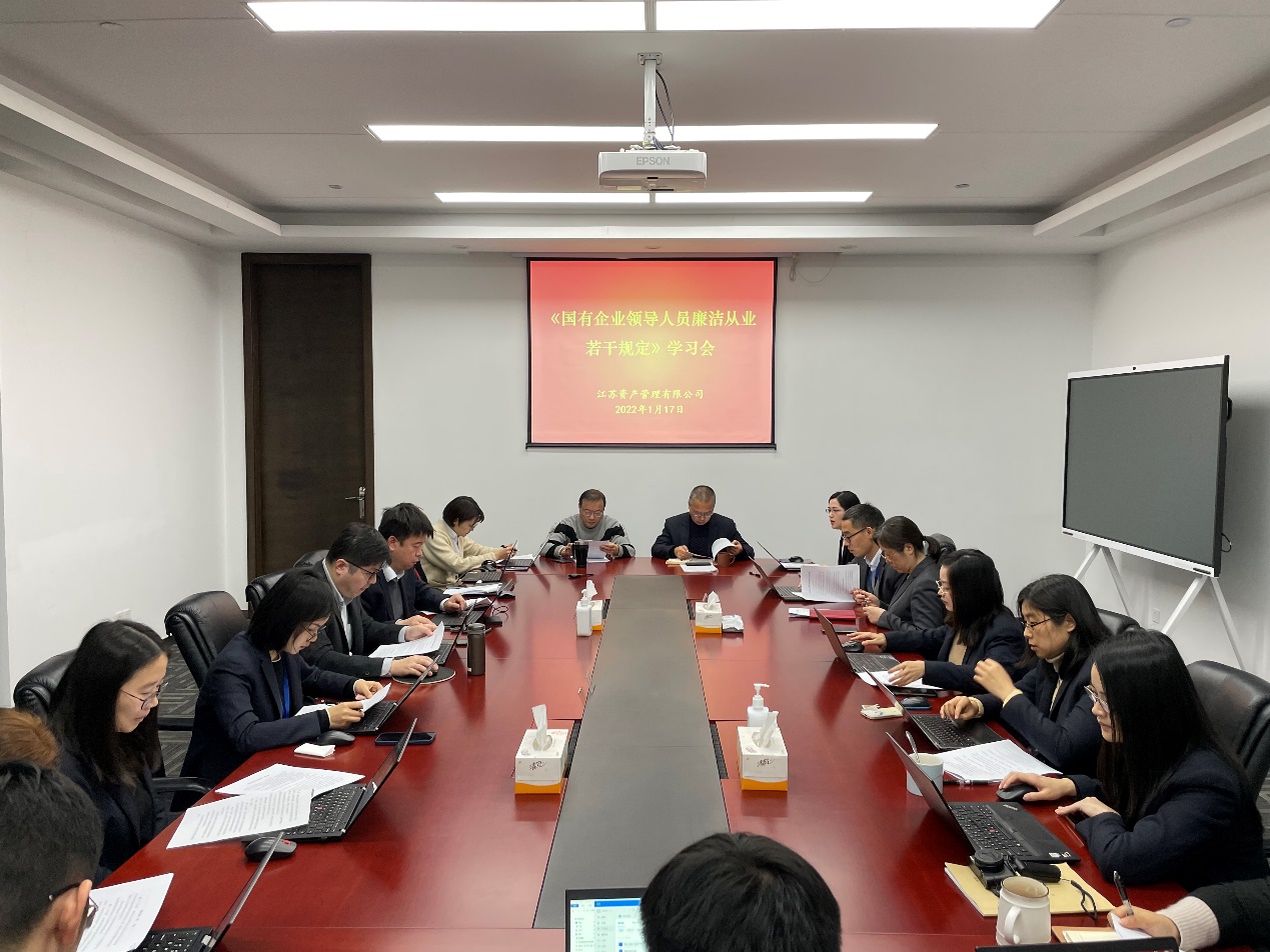 为进一步加强公司日常廉洁教育,规范党员干部廉洁从业行为,1月17日,江苏资产纪委组织集中学习《国有企业领导人员廉洁从业若干规定》,公司领导班子成员、各部门负责人参加学习。